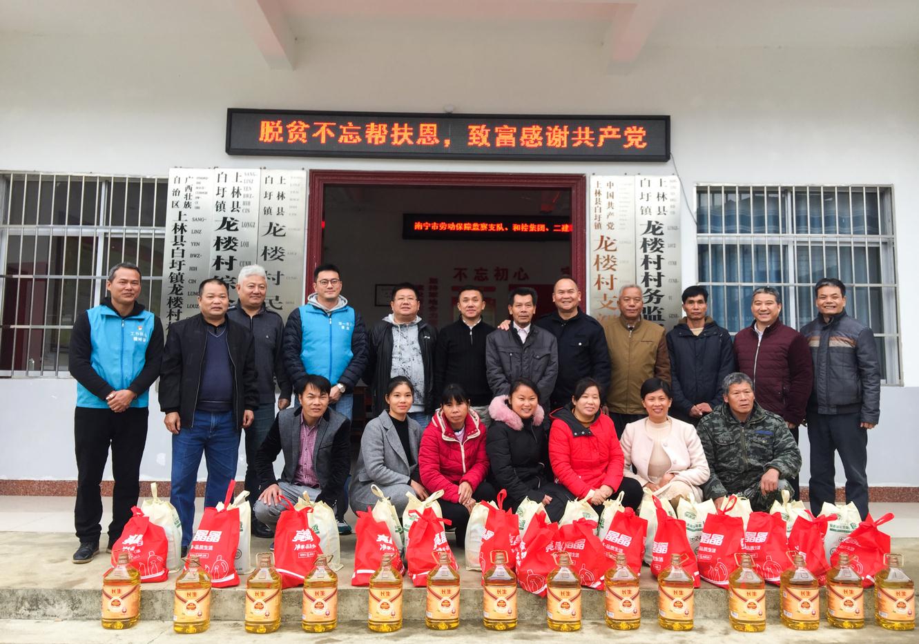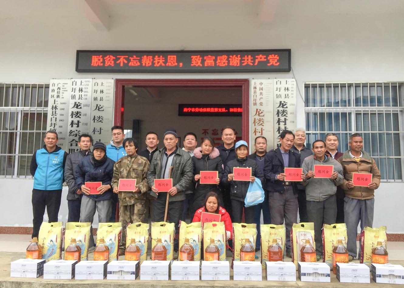 1月16日,受集團黃偉文總裁的委托,懷著對精準扶貧結(jié)對點鄉(xiāng)親們的牽掛,集團黨支部書記周云、集團高管及員工代表,會同我司結(jié)對共建單位南寧市勞動保障監(jiān)察支隊的支隊長、支部書記趙斌,副支隊長、支部副書記趙健等同志,帶著價值15000余元的慰問品,再次趕往上林縣白圩鎮(zhèn)龍樓村和大浪村開展一年一度的春節(jié)扶貧慰問活動,送去和桂家人的關(guān)心和溫暖。