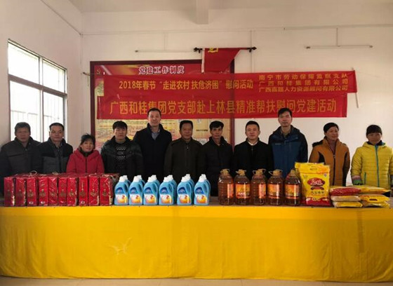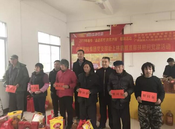 寒冬送溫暖,愛(ài)心滿和桂值2018年新春佳節(jié)即將到來(lái)之際,為了表達(dá)對(duì)困難戶、低保戶和貧困黨員的關(guān)愛(ài)和幫助,讓他們度過(guò)一個(gè)快樂(lè)、平安、祥和的新春佳節(jié)。2018年2月2日,廣西和桂集團(tuán)黨支部書(shū)記周云同志、人力行政總監(jiān)梁偉同志等一行四人代表集團(tuán)公司,會(huì)同我們的聯(lián)建單位-南寧市勞動(dòng)保障監(jiān)察支隊(duì)黨支部書(shū)記趙斌同志帶領(lǐng)的支部成員,一起到南寧市上林縣白圩鎮(zhèn)龍樓村開(kāi)展“寒冬送溫暖,愛(ài)心滿和桂”的精準(zhǔn)扶貧,慰問(wèn)貧困戶家庭的黨建活動(dòng)。慰問(wèn)團(tuán)一行深入農(nóng)村,走進(jìn)貧困家庭,為他們送去了慰問(wèn)金和油、米、保適潔洗衣液、節(jié)日禮包等生活用品,送去了集團(tuán)公司的關(guān)懷和溫暖。