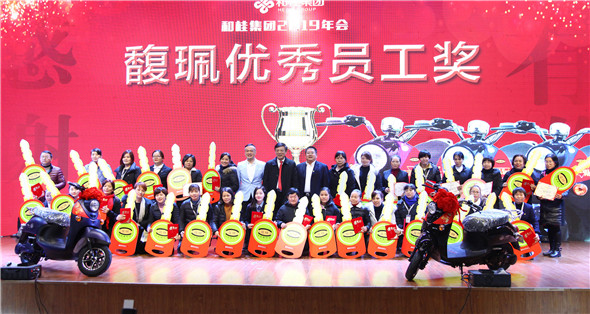 (廣東雅娜集團(tuán)有限公司總裁呂在坤和集團(tuán)常委頒發(fā)年度“馥珮”優(yōu)秀員工獎,每人一輛電動車)