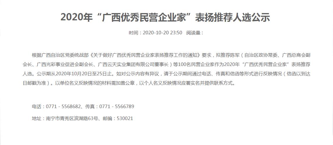10月29日,在廣西第一個(gè)“民營企業(yè)家日”到來之際,自治區(qū)黨委統(tǒng)戰(zhàn)部、自治區(qū)工商聯(lián)、自治區(qū)非公有制經(jīng)濟(jì)工作領(lǐng)導(dǎo)小組辦公室對(duì)100名優(yōu)秀民營企業(yè)家進(jìn)行通報(bào)表揚(yáng),和桂集團(tuán)總裁黃偉文實(shí)力入選。